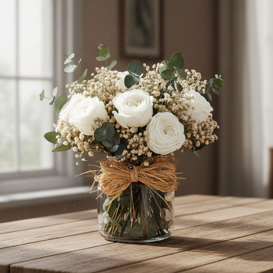RAMO DE 6 ROSAS PRESERVADAS BLANCAS CON JARRÓN