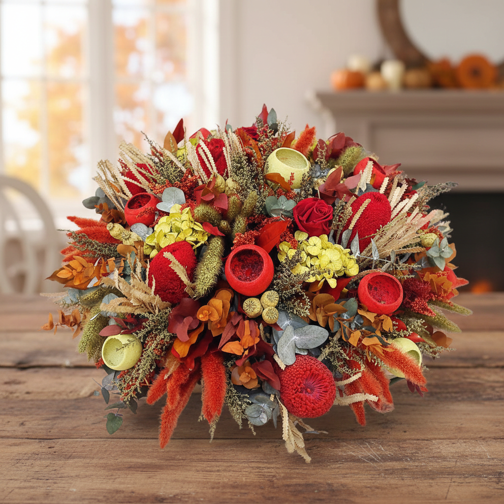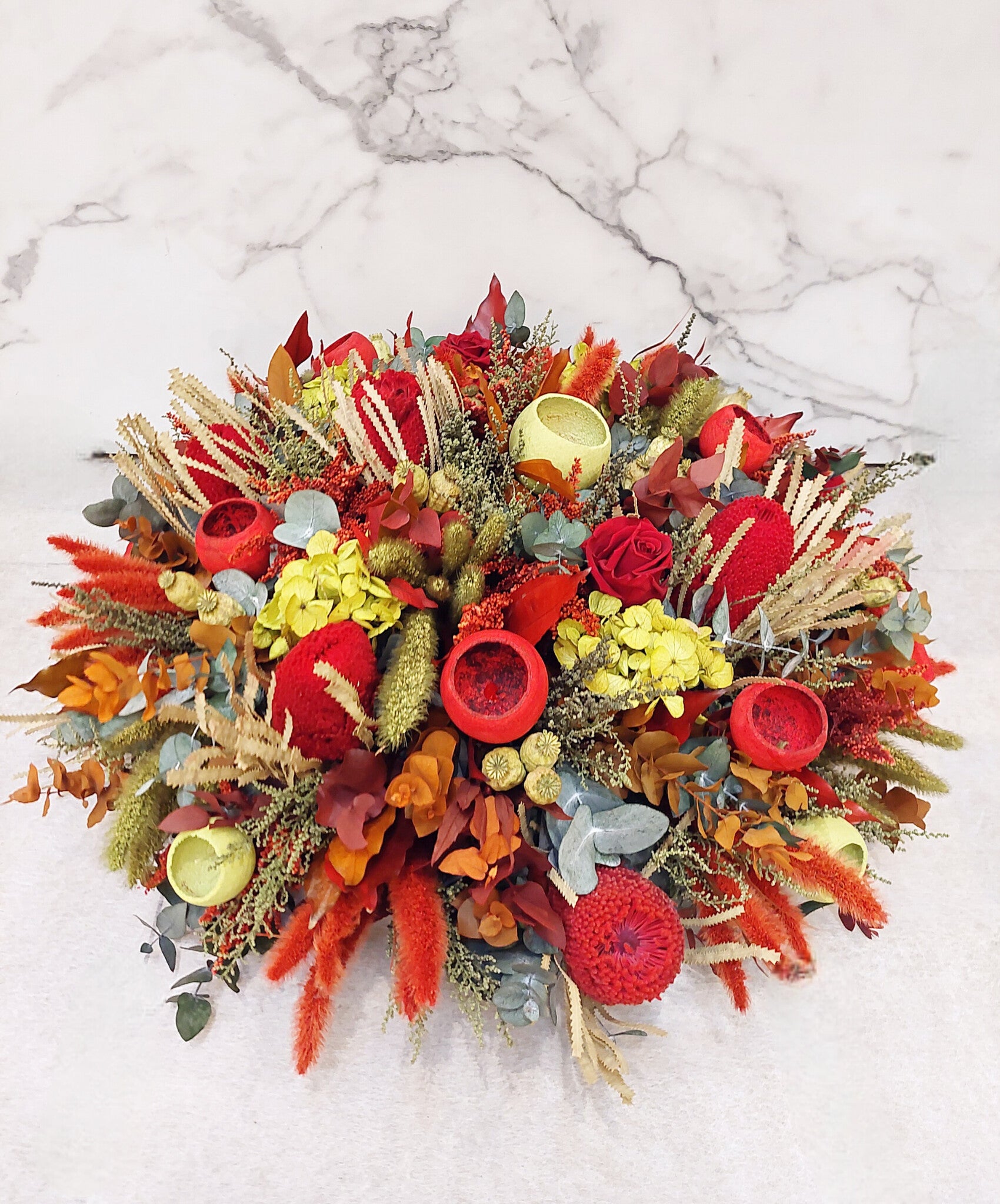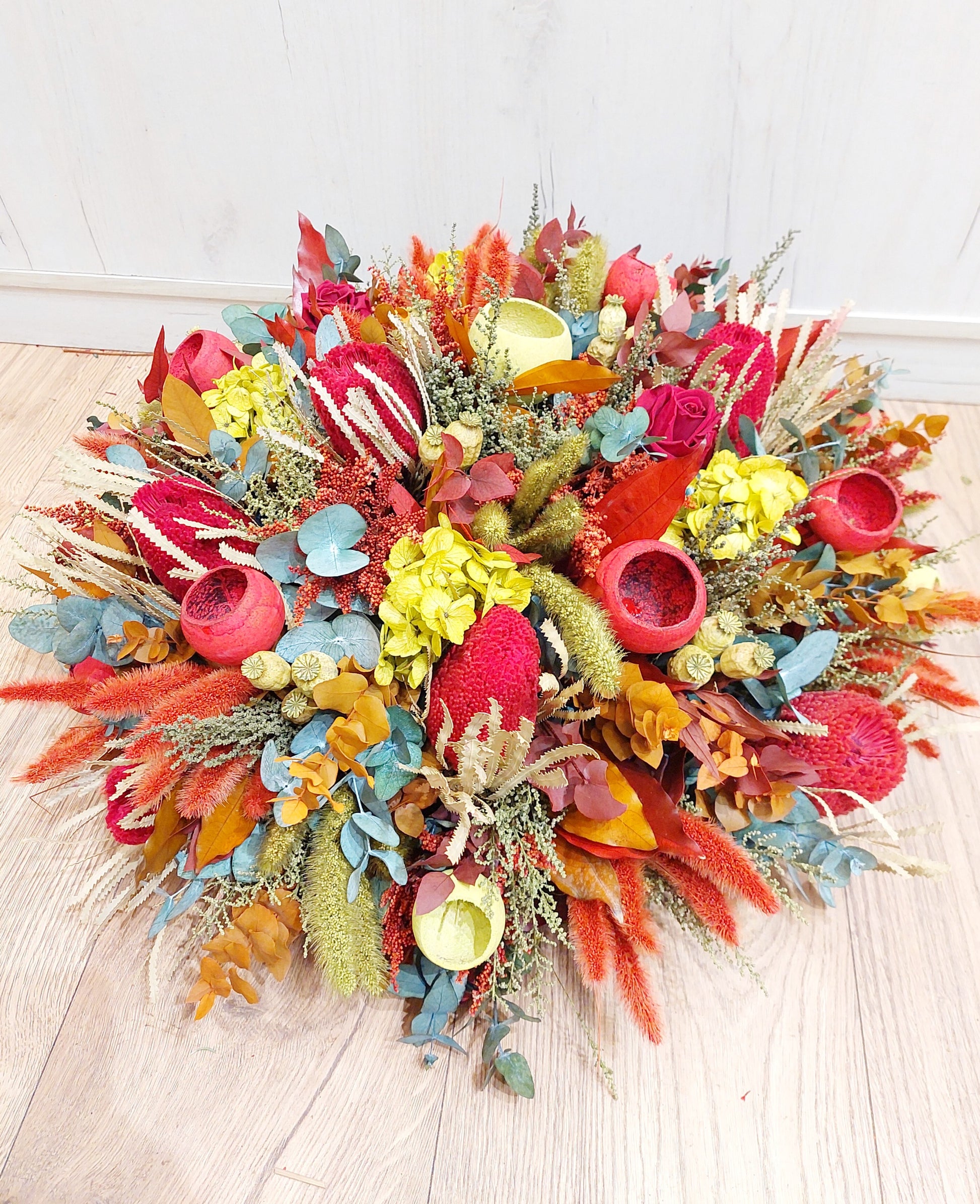 Centro de mesa con flores preservadas y secas XXL de 55 cm de diámetro, trabajada cuidadosamente por nuestros maestros floristas. Centro seco en color a elegir. ¡Simplemente espectacular!