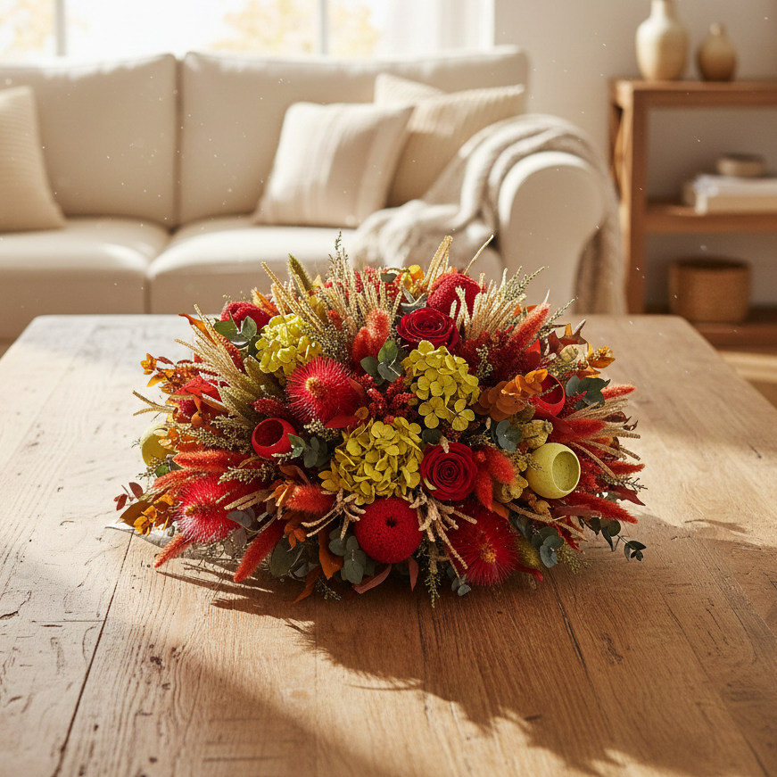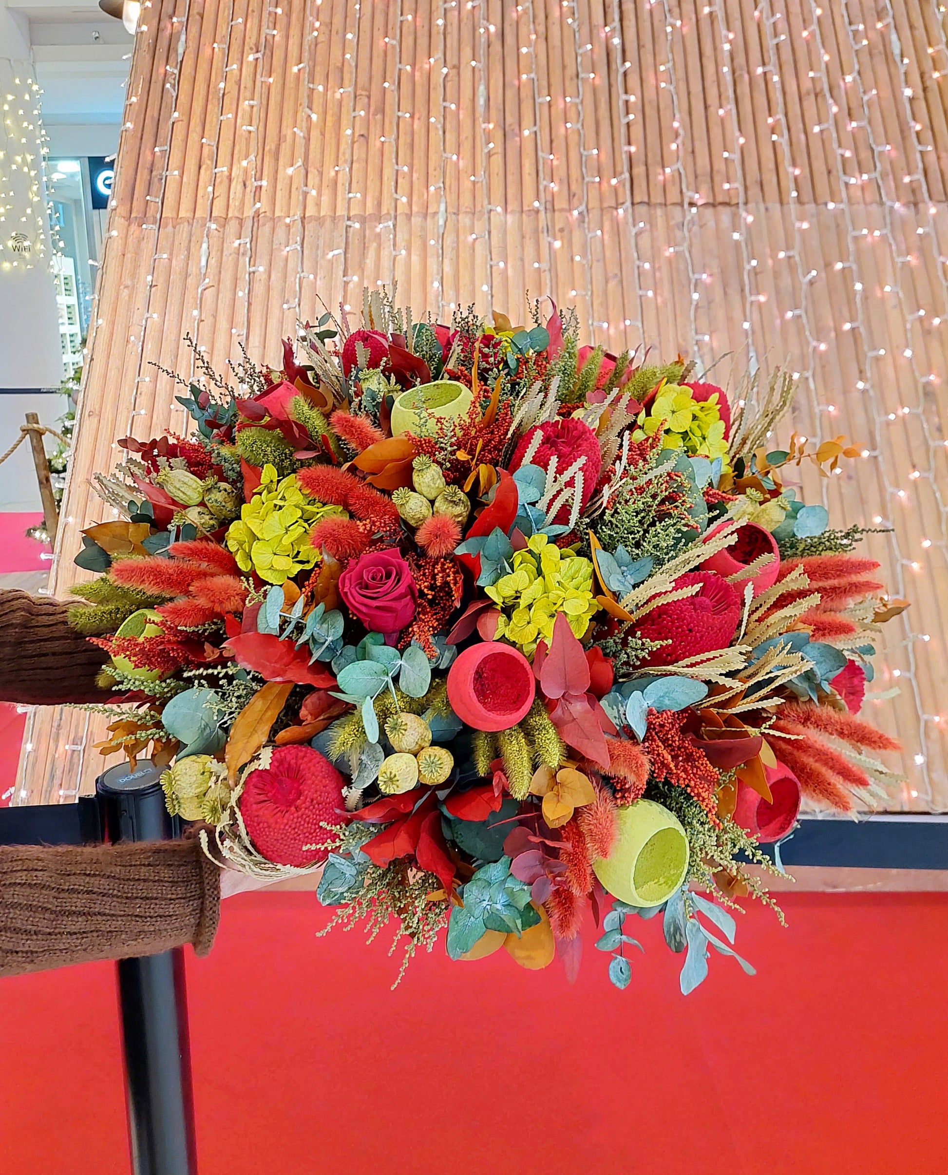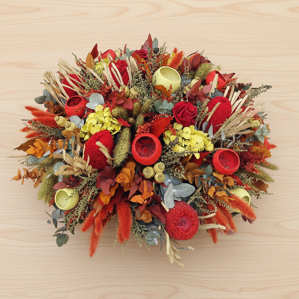 Centro de mesa con flores preservadas y secas XXL de 55 cm de diámetro, trabajada cuidadosamente por nuestros maestros floristas. Centro seco en color a elegir. ¡Simplemente espectacular!