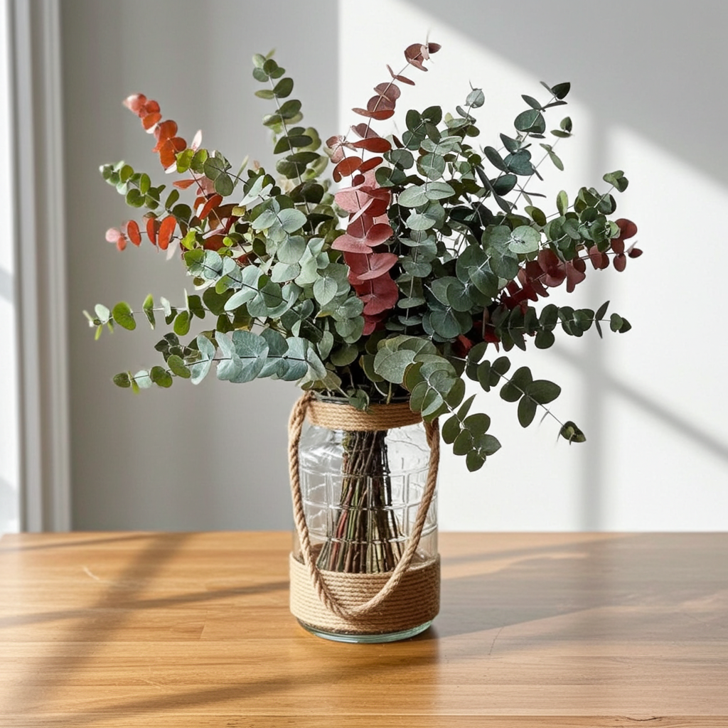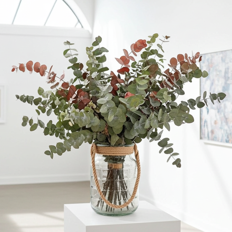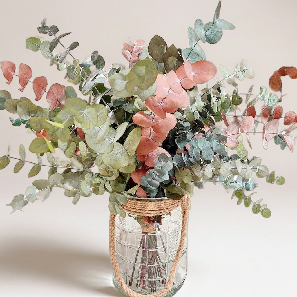 Ramo con eucalipto preservado (rojo y verde). Ramo de decoración trabajado cuidadosamente por nuestros maestros floristas. Las flores preservadas son flores naturales tratadas para que se mantengan frescas sin agua.
