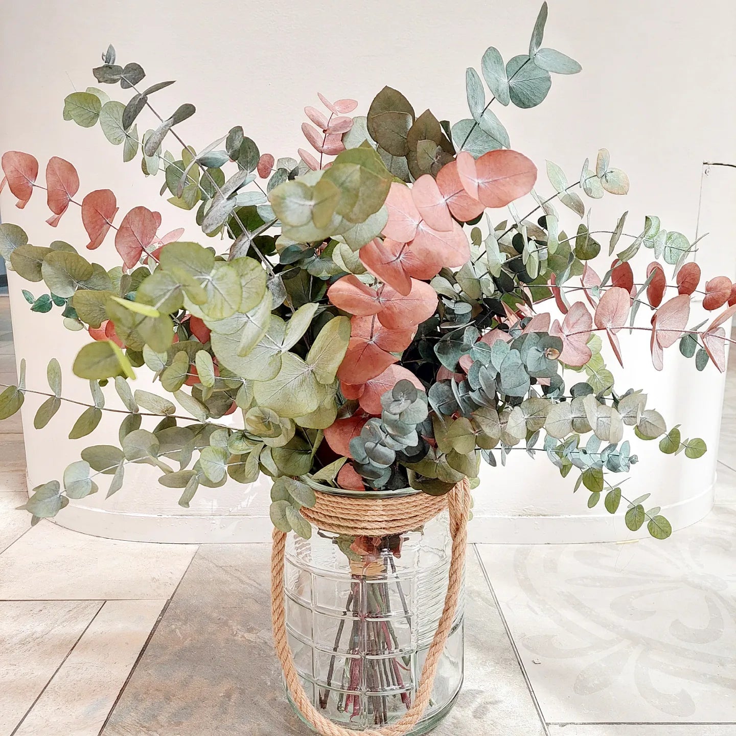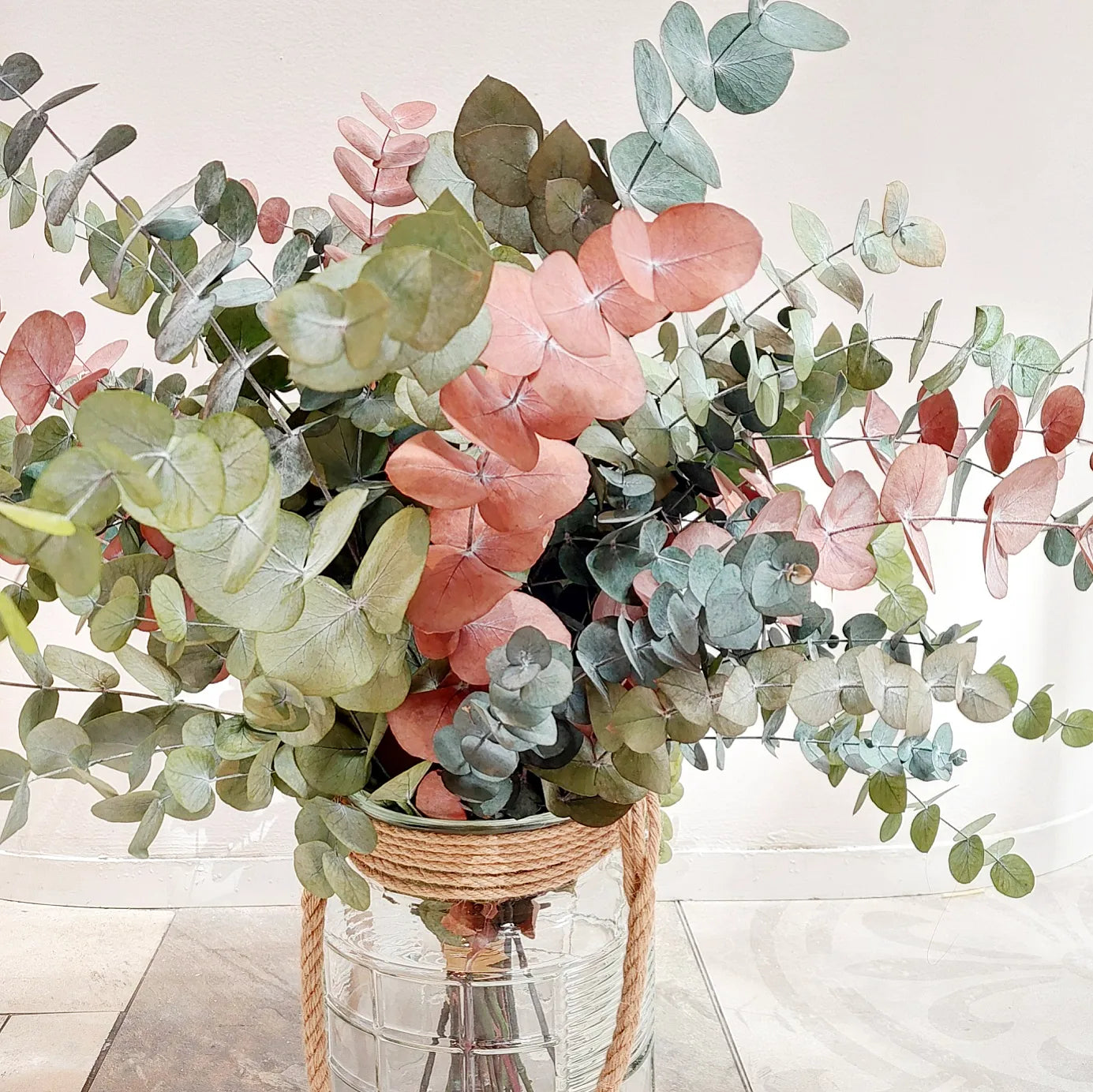 Ramo con eucalipto preservado (rojo y verde). Ramo de decoración trabajado cuidadosamente por nuestros maestros floristas. Las flores preservadas son flores naturales tratadas para que se mantengan frescas sin agua.