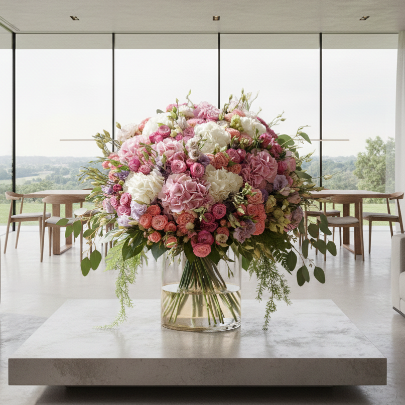 Ramo estilo bouquet lleno de flores al más puro estilo europeo, con flores delux, las más especiales y JARRÓN INCLUIDO. Uno de los ramos más especiales que tenemos. Cuidadosamente seleccionados por nuestros maestros floristas. El ramo contiene flores variadas, hortensias, rosas de pitimini, rosas de jardín, peonias según temporada , con mucho colorido, verdes variados y flores silvestres menuditas combinadas con mucho gusto. ¡Para alguien muy especial!