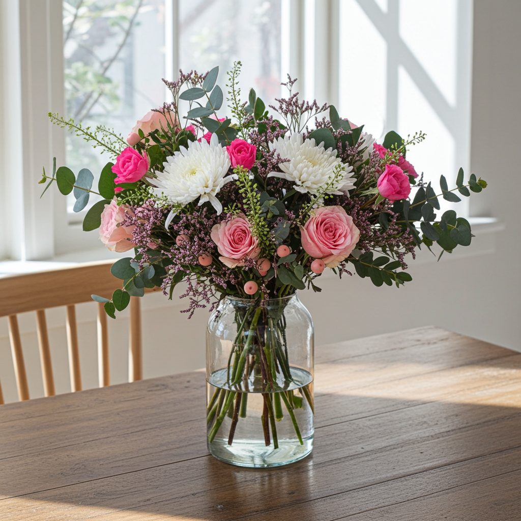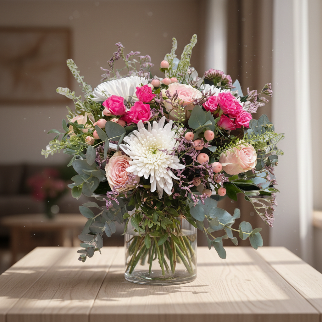 Ramo con flores premium y jarrón incluido cuidadosamente seleccionados por nuestros maestros floristas. El ramo contiene flores variadas como rosas rosadas hypericum, anastasias, flor de relleno y verdes variados ¡Para alguien muy especial!
