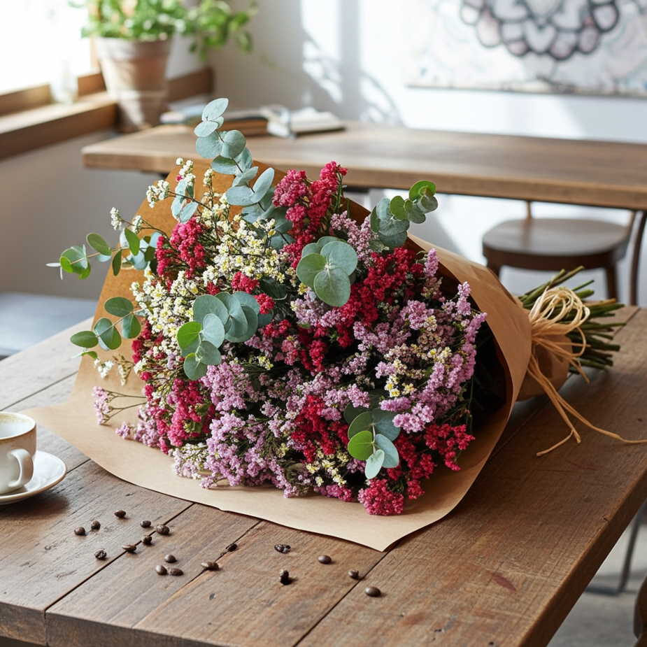 Ramo con flores de estilo silvestre perfecto para dejarlo secar y que dure mucho tiempo cuidadosamente seleccionados por nuestros maestros floristas. El ramo contiene flores menuditas como cogidas del campo y mucho verde variado. ¡Para enamorados de la naturaleza!