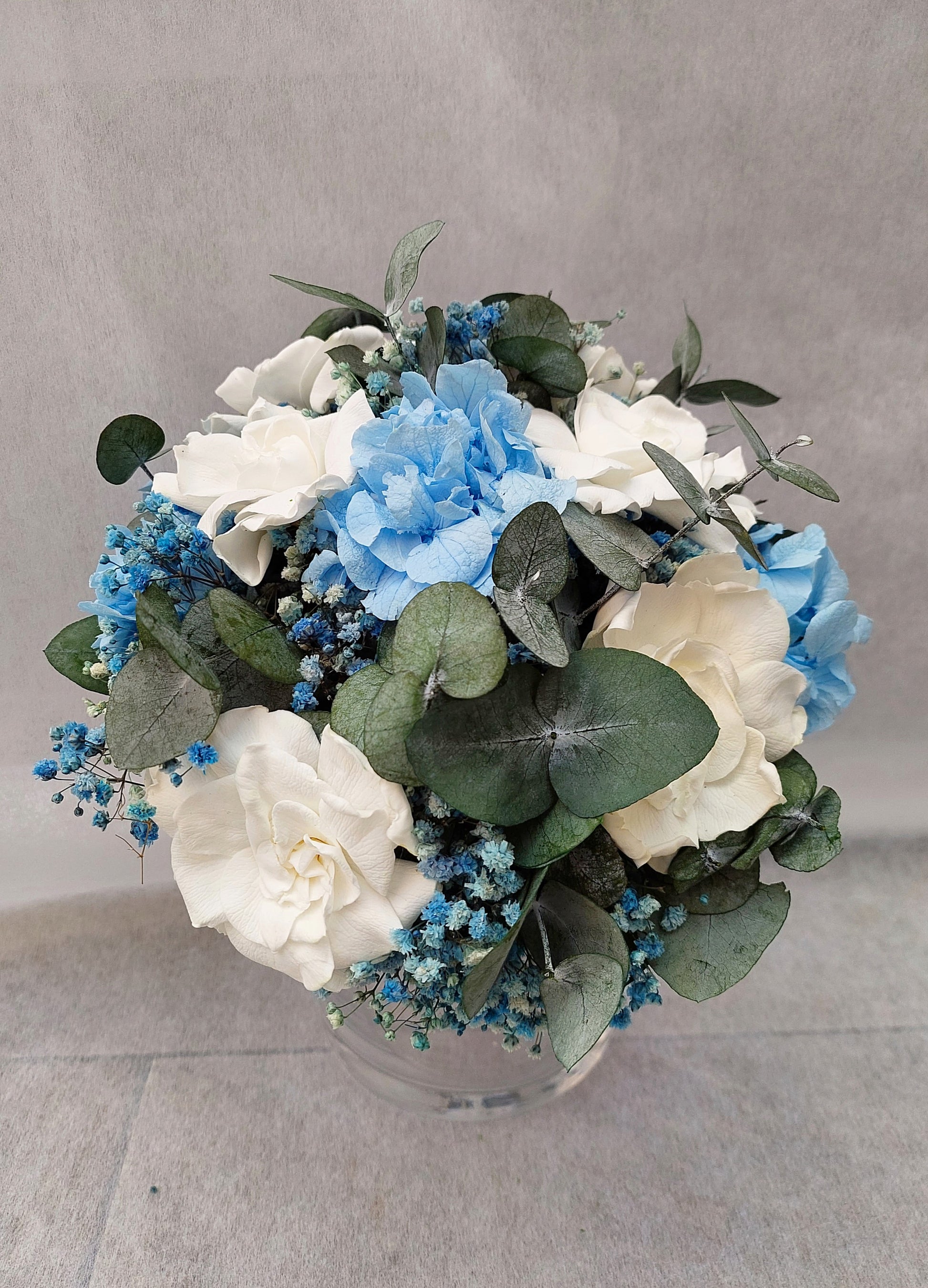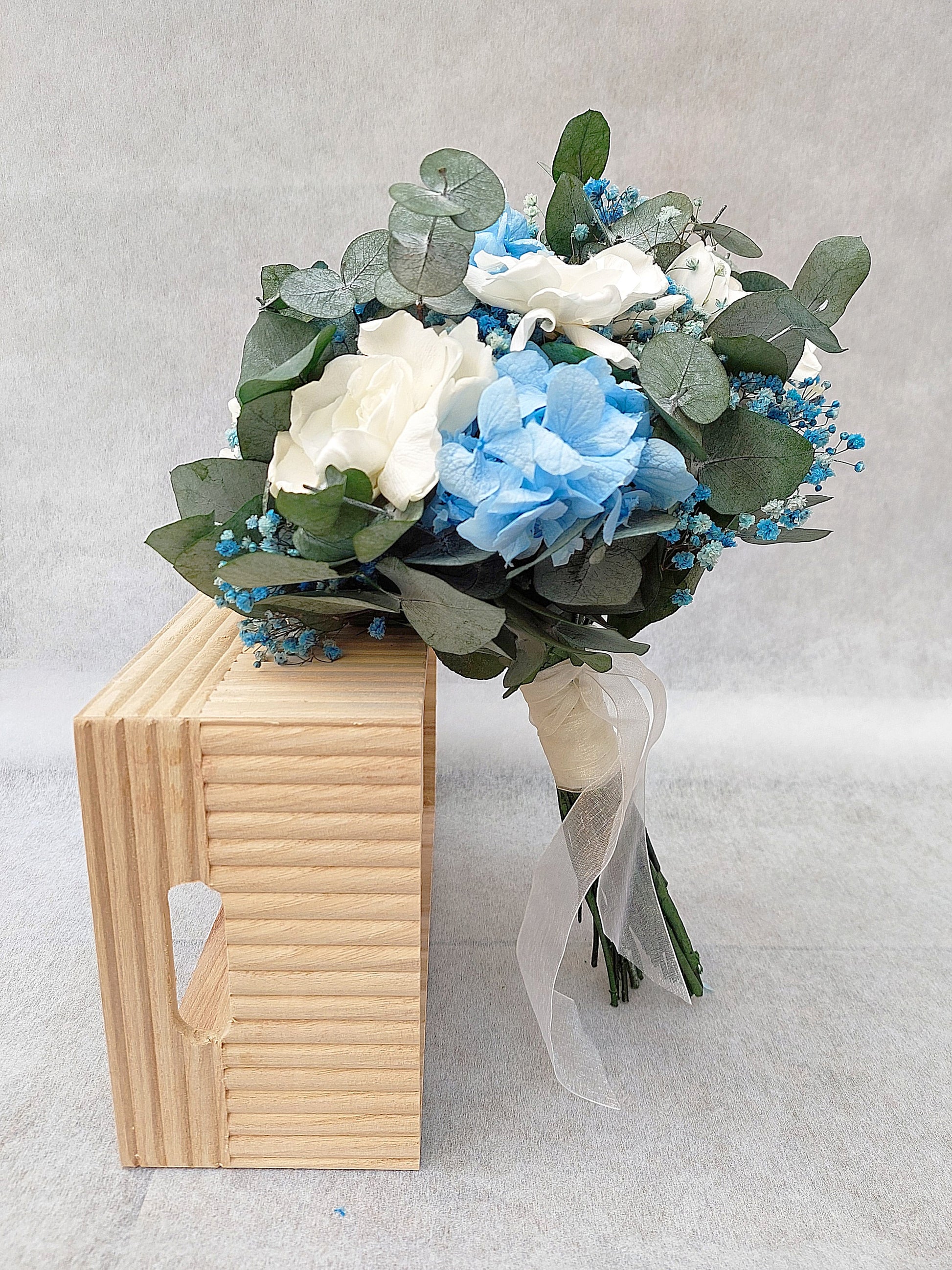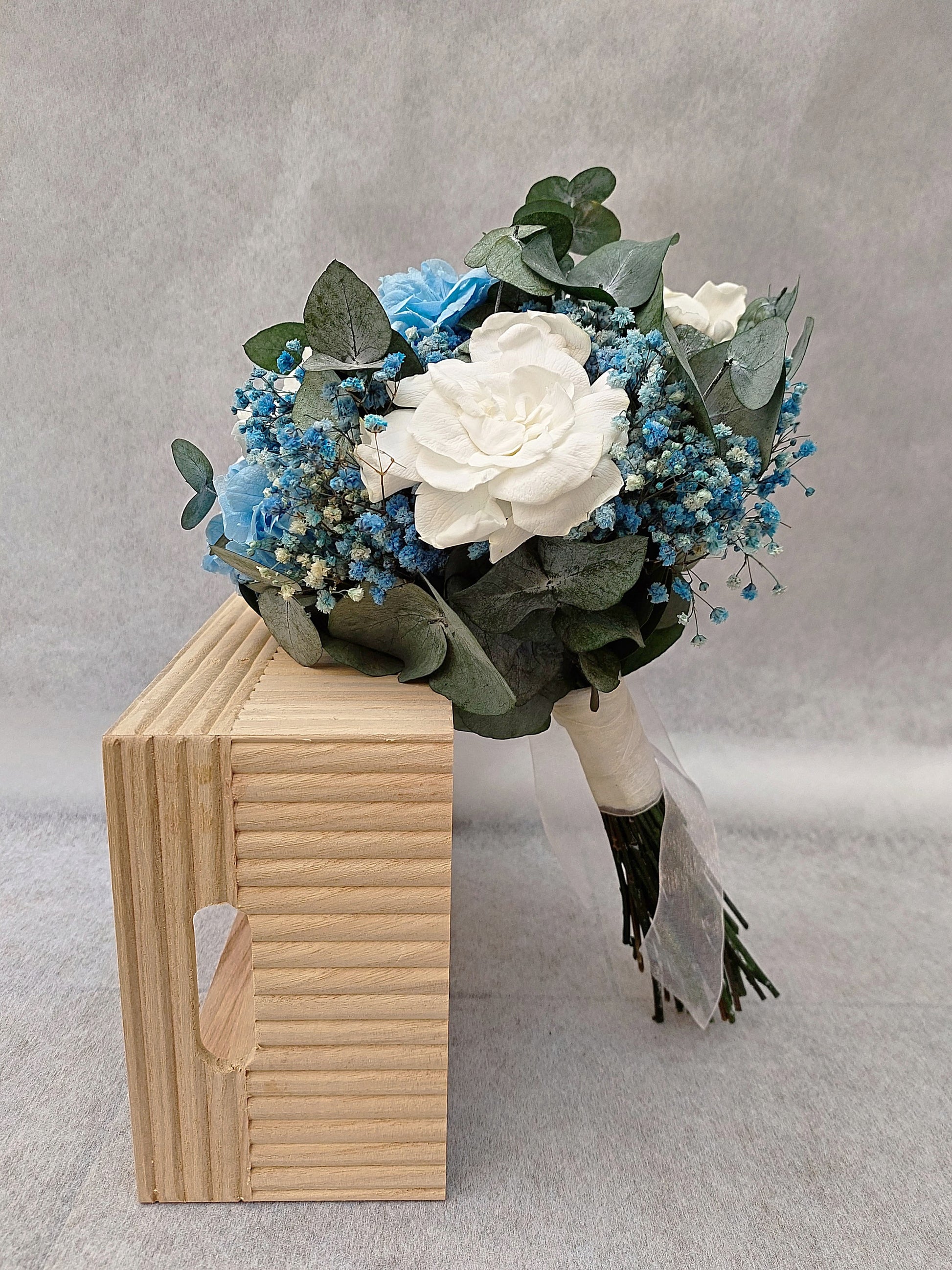 Ramo de novia en tonos blancos y azules, con gardenias preservadas, hortensias azules preservadas, paniculata preservada y verdes preservados de relleno. Un ramo muy trabajado cuidadosamente por nuestros maestros floristas, creando una composición preciosa. Las flores preservadas son flores naturales tratadas para que se mantengan frescas sin agua.