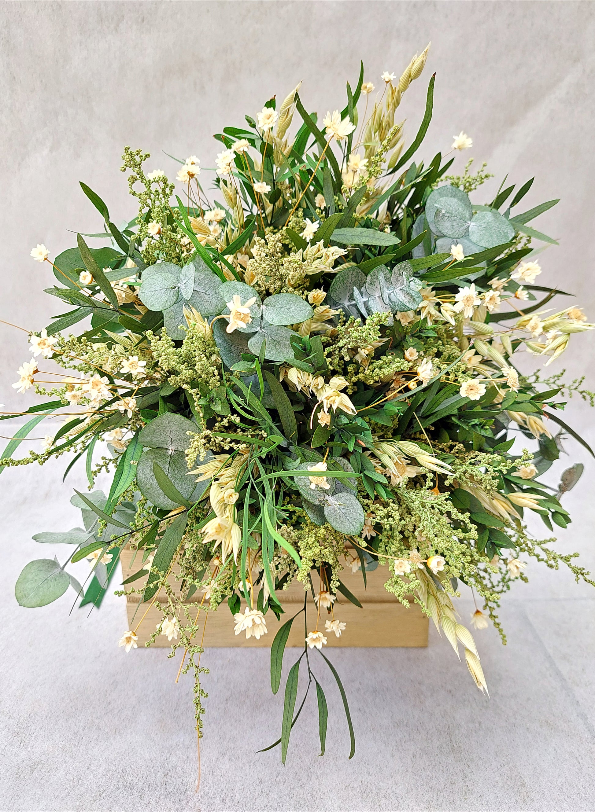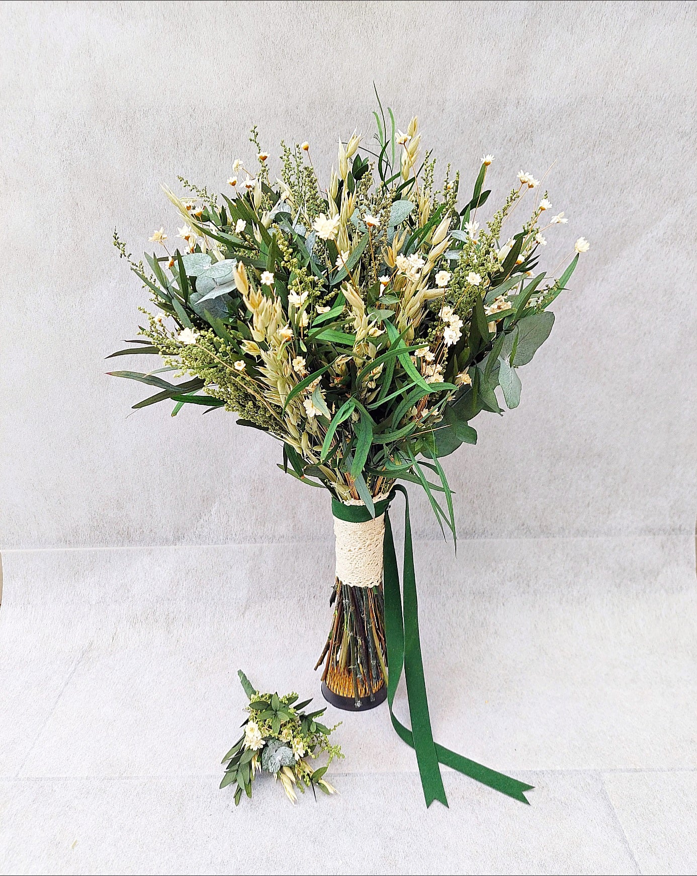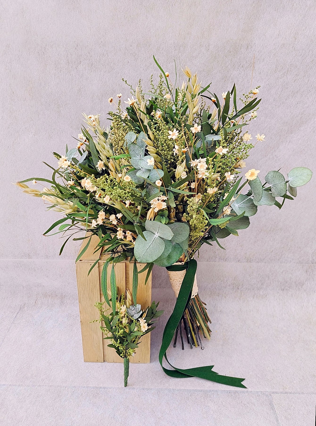 Ramo de novia silvestre en tonos blancos y verdes, con brezo preservado, eucalipto cinerea y eucalipto parvifolia preservadas, avena, paniculata y verdes preservados de relleno. Un ramo muy trabajado cuidadosamente por nuestros maestros floristas, creando una composición preciosa. Las flores preservadas son flores naturales tratadas para que se mantengan frescas sin agua.