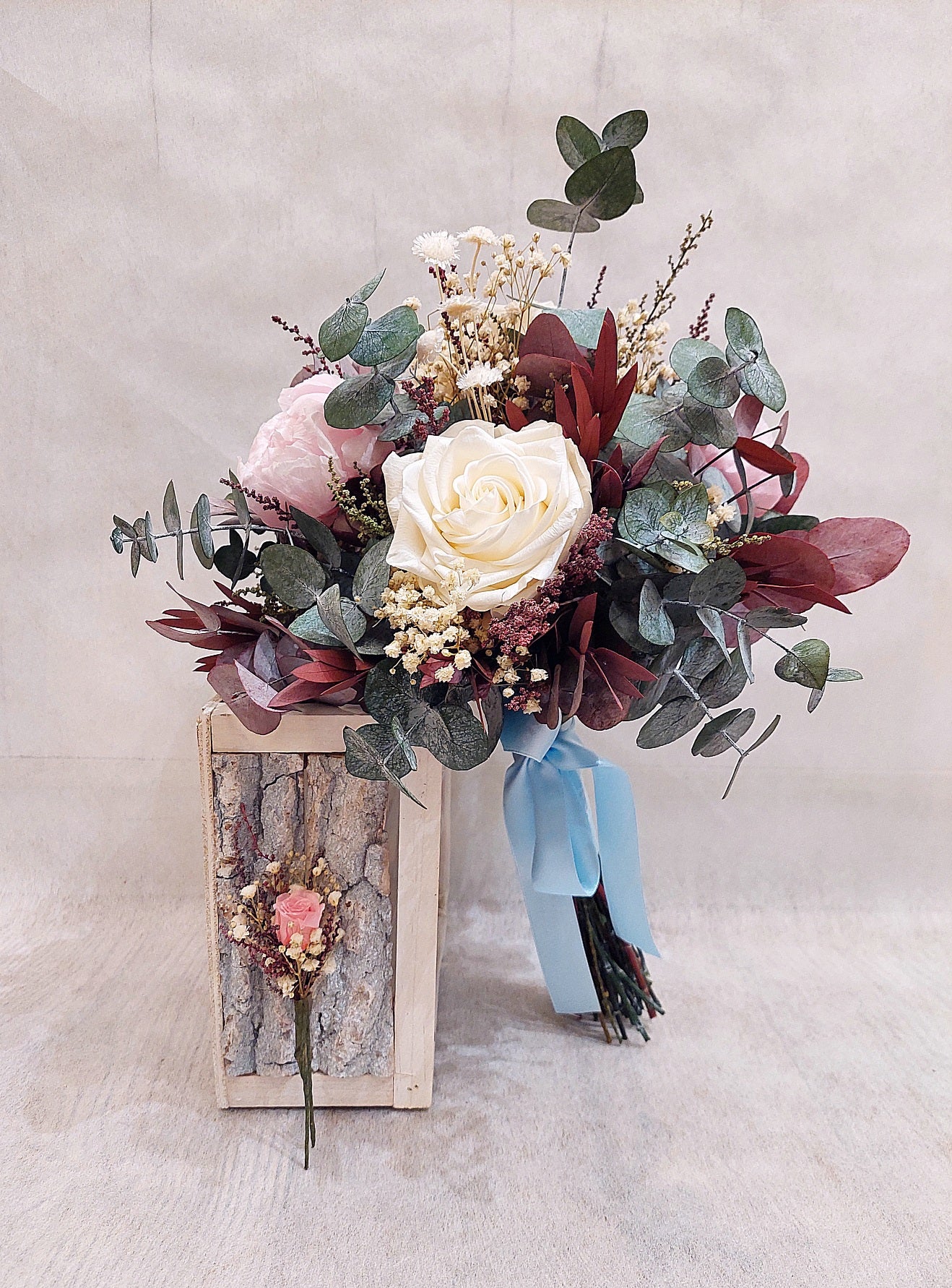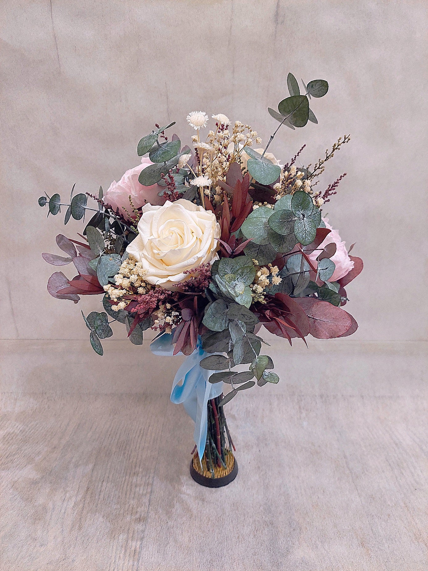 Ramo de novia preservado compuesto por rosa blanca premium preservada, peonias rosas preservadas, hojas preservadas ocres, flores de brezo preservado y eucalipto verde preservado de relleno. Un ramo muy trabajado cuidadosamente por nuestros maestros floristas, creando una composición preciosa. Las flores preservadas son flores naturales tratadas para que se mantengan frescas sin agua.