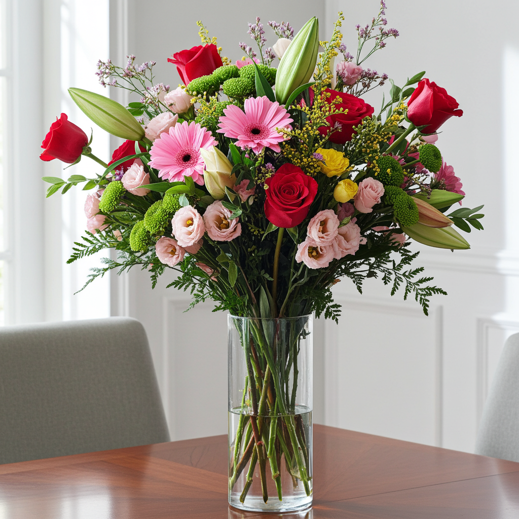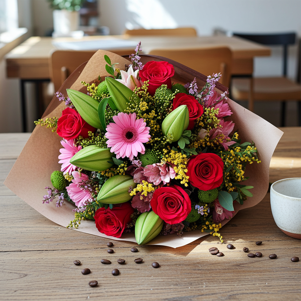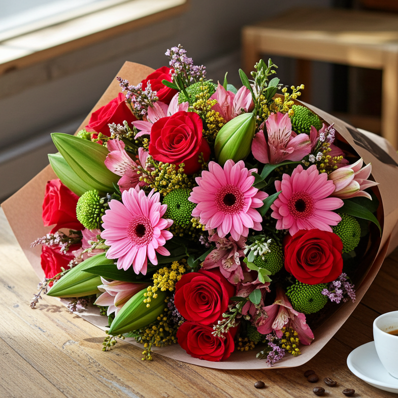 Ramo con flores variadas y rosas rojas cuidadosamente seleccionados por nuestros maestros floristas. El ramo contiene flores variadas con olor, rosa roja, verdes variados y flores coloridas combinadas con mucho gusto. ¡Para alguien muy especial!
