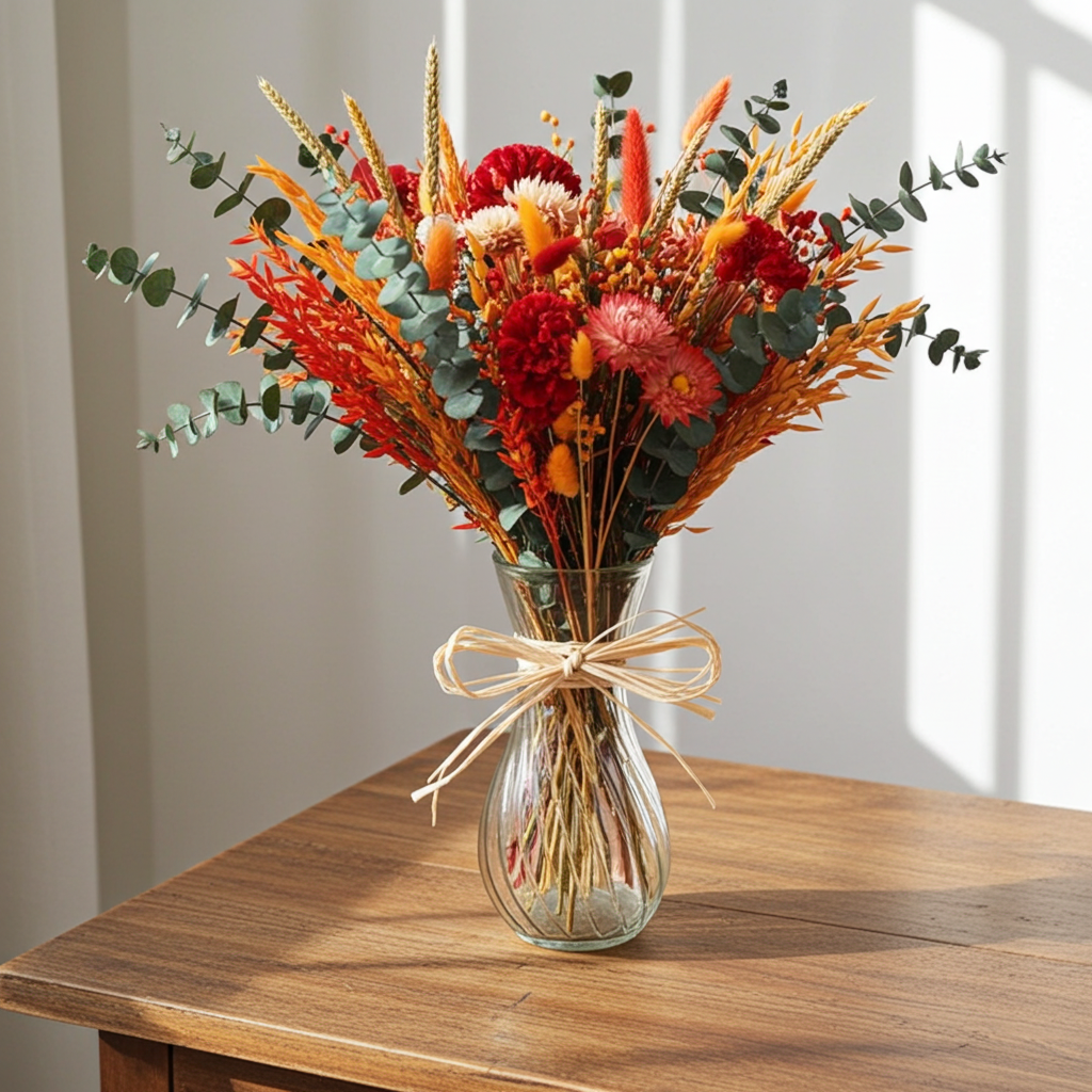 Ramo con flores preservadas trabajadas cuidadosamente por nuestros maestros floristas. Ramo preservado en tonos naranjas.